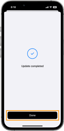 - When you see the Update completed message, tap the Done button to exit the firmware update process.