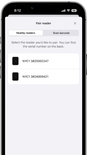 - Select the reader to pair using its serial number (or tap Scan barcode and scan the serial number barcode on the back of the reader).