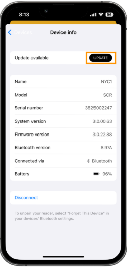 - Tap the connected reader to load the Device info screen.