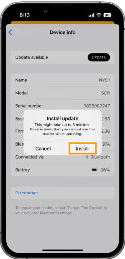 - Tap Install on the dialog to initiate the firmware update.