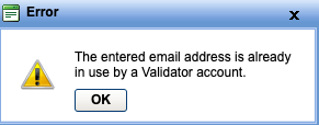 The username (email address) must be unique per location, a duplicate username can not be used. If a duplicate username is entered, the system will display the following error message.