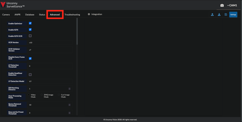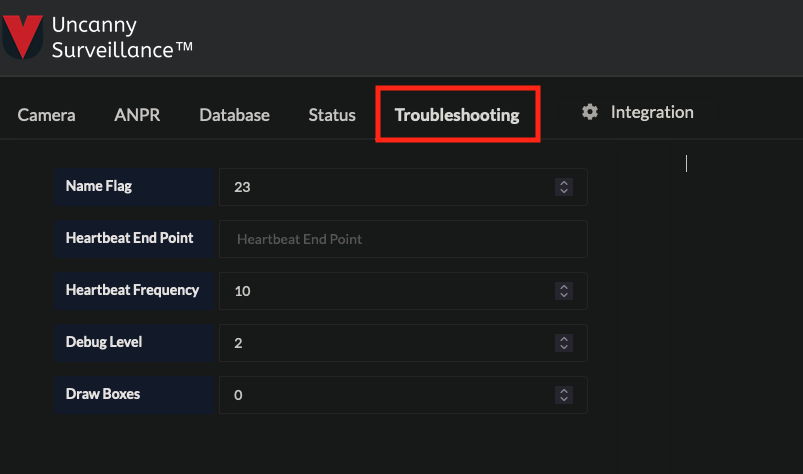 - Once all cameras have been configured, click the Troubleshooting tab and configure the following settings: