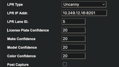 - License plate, make, model, and color confidence should each be set to 20.