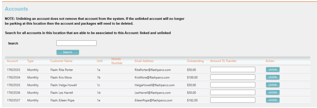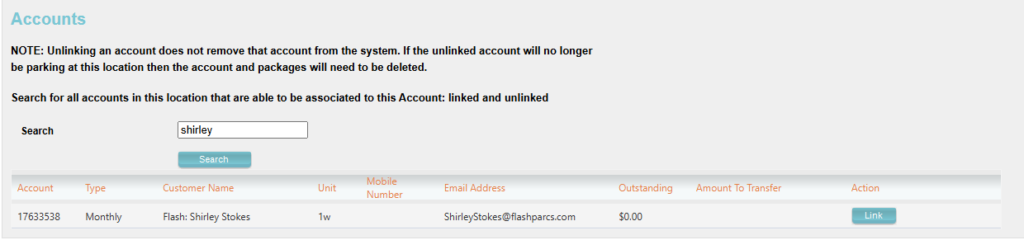 Using the search field, you can search for a potential child account by entering the account number, customer name, mobile number, email address, or unit number.