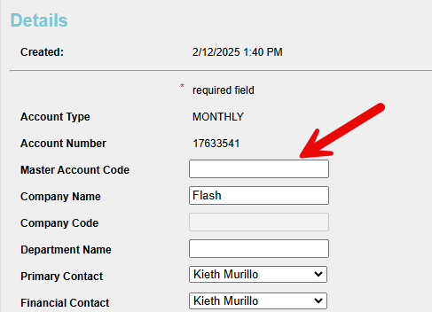 Once you have selected the monthly account, enter the Master Account Code into the Master Account Code field and Save. (i.e. CocaCola)