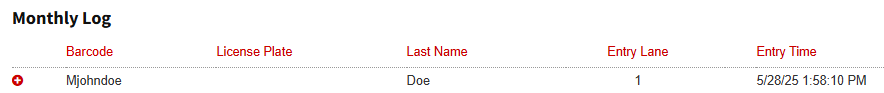 Monthly, third-party, and Parkonect order names continue to appear in the garage log and reports, even if they are not shown on the kiosk screen.