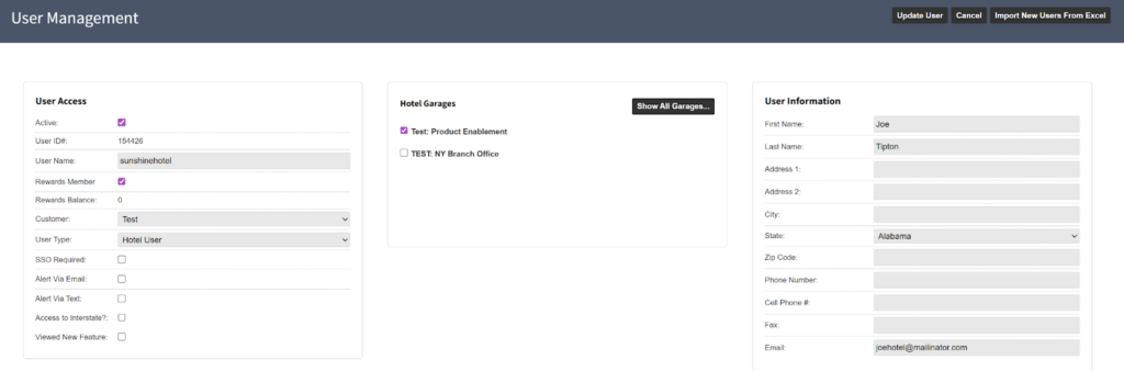 - Select hotel garages to which this user will be assigned; multiple can be selected.