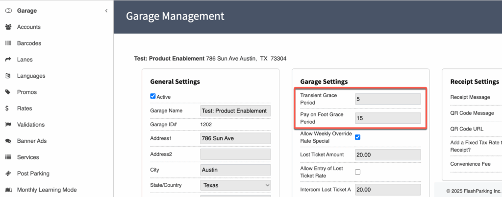 The Grace Period is set at the Location level under the Garage Profile tab.
