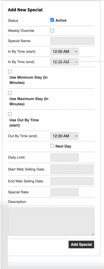 • By checking the “Use Out By Time Start” box, you will create a window in which the parker must exit the facility between specific times to qualify for the special.
