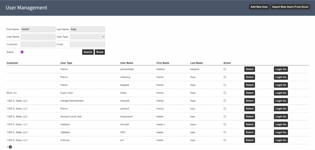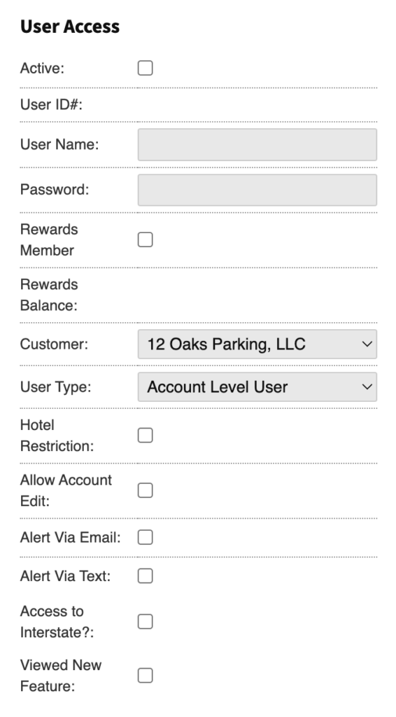 - Account Level users: only have access to specifically chosen monthly accounts for add/edit/review functionality. These users have access to monthly/account-related reporting only and have no access to garage-level settings or financial information. Parking operators can provide Account Level User access to their clients, such as residential property managers