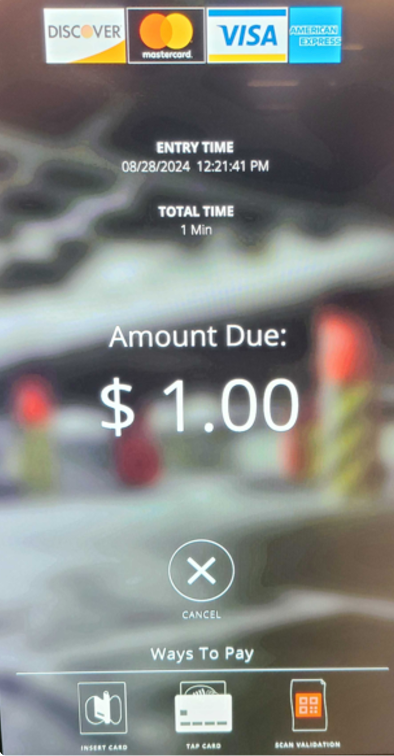 The system pulls the Amount due based on the license plate captured at entry.