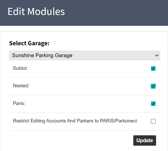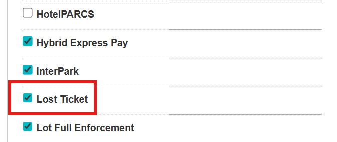 - Check the Lost Ticket module flag from the right-hand side list > be sure to click the Update under the garage selection.