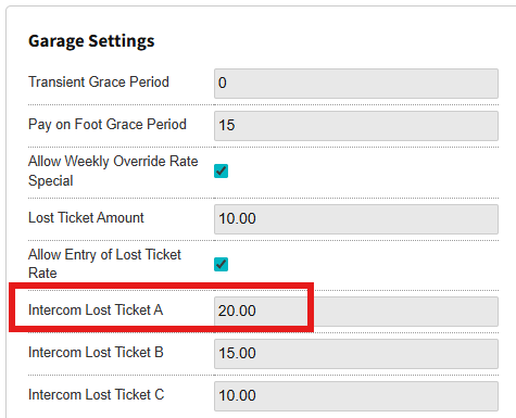 - Under the Garage Settings section select an amount for the Intercom Lost Ticket A, this will be the default price for the kiosk’s Lost Ticket button > Click the Update button.