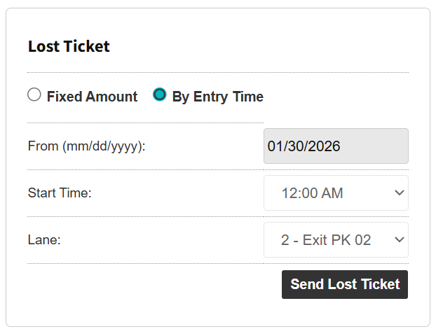 This allows a Dynamic Entry time to calculate the standard rate for the Lost Ticket and send it to the lane via the Send Lost Ticket button using the Garage Log.