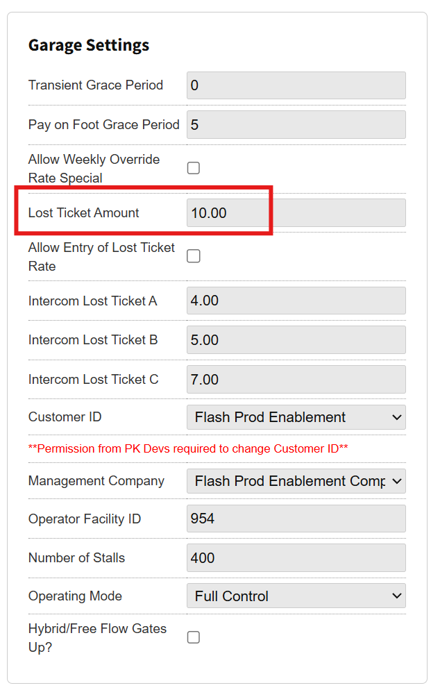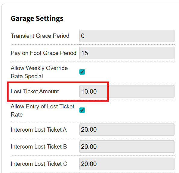 - The Garage Setting section includes the Lost Ticket Amount option; edit it to the desired default price for the lost ticket.
