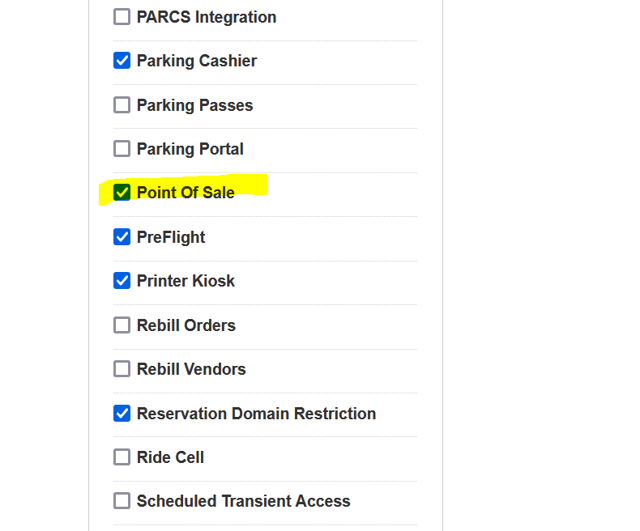 For each garage that will use the Point-of-Sale module, navigate to Parkonect → Modules, select the garage in the dropdown, and ensure Point Of Sale is checked: