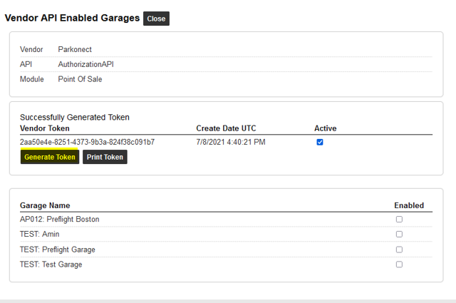 Because the Vendor Authentication Token is used for security and to control access, it should not be shared across the entire Parkonect system. Rather, new Vendor Authentication Tokens should be generated for each Point-of-Sale system so that in the event a token must be revoked it has limited impact on our customers.