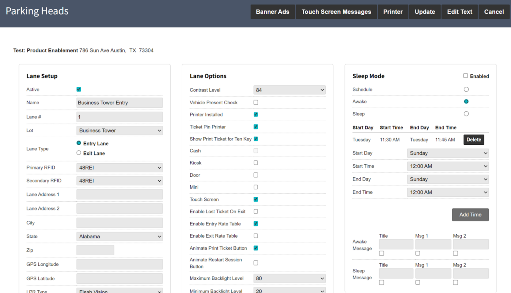 In PK Admin, go to Garage > Garage Setting > Lanes > (select lane). Enable Sleep Mode then choose between one of these options: Schedule, Awake, and Sleep.
