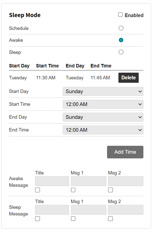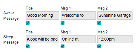 Below the schedule creation section is a set of boxes for making changes to Awake Message and Sleep Message on the screen. A Title, Message 1, and Message 2 can be placed, each taking one line on the kiosk screen.