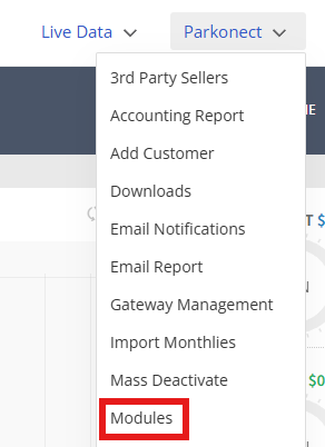 1. In the Parkonect portal, go to the Parkonect dropdown and select Modules.