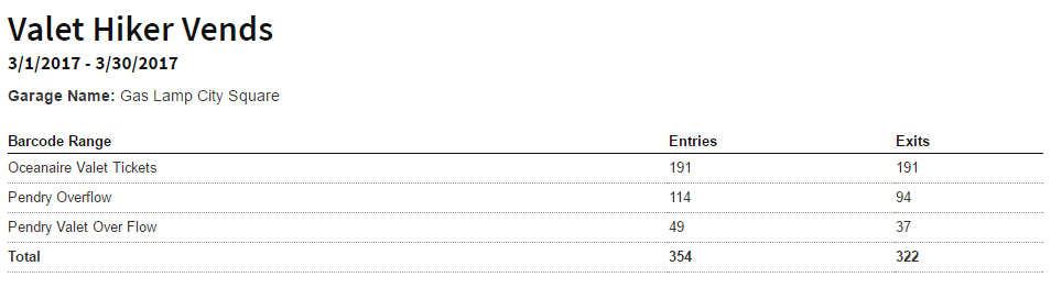 This is a summary report for all vends by valet account and will return both entry and exit vends for each account based on the following parameters:
