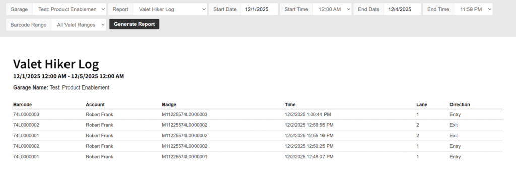 - Barcode Range—You can run this report for all barcodes or for a specific valet barcode range.