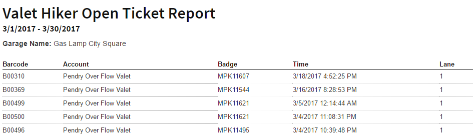 This report allows you to see all open valet tickets in your garage based on the following parameters: