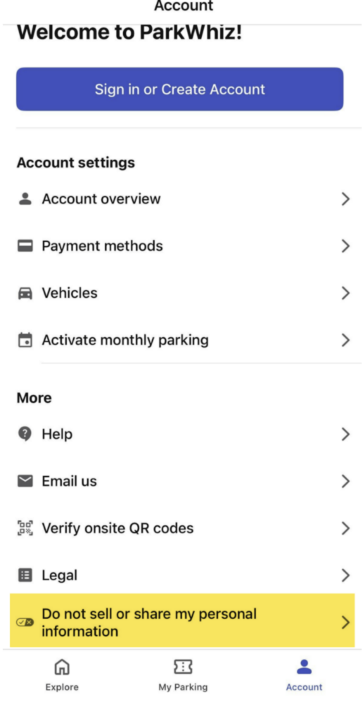 ParkWhiz is compliant with Global Privacy Control (GPC), allowing users to notify ParkWhiz that they do not want their personal information shared or sold. GPC options are available within the ParkWhiz app under the Account menu and in the footer of the ParkWhiz website.