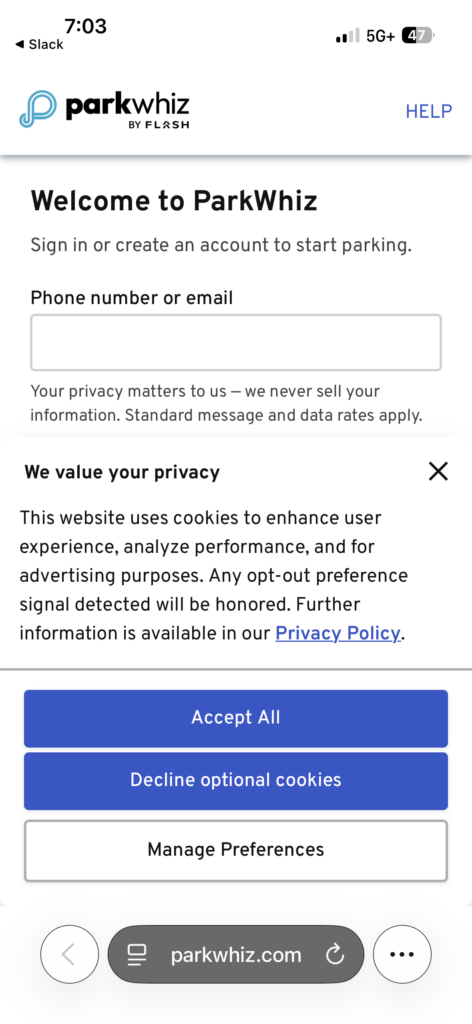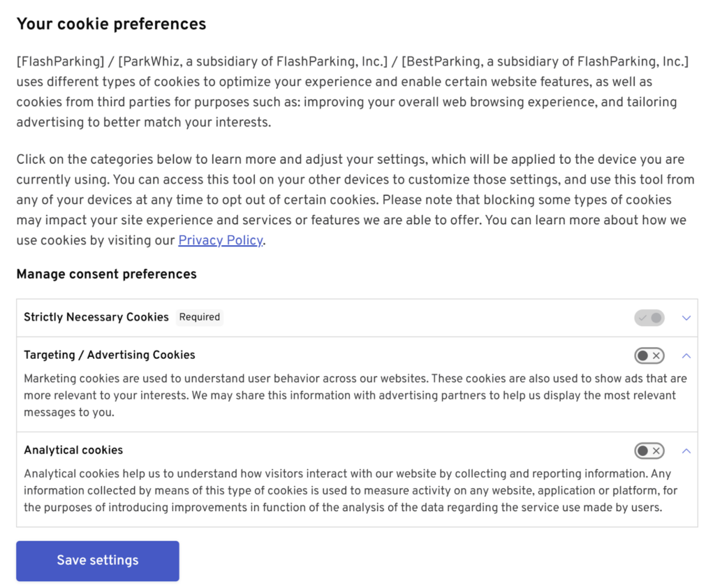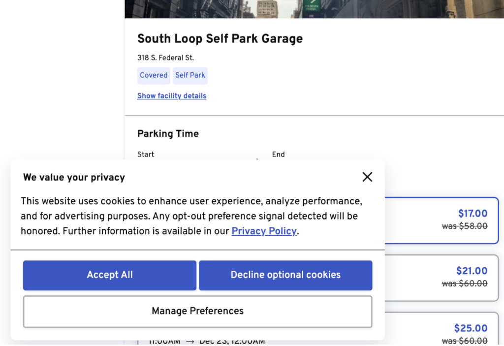 ParkWhiz offers built-in privacy controls that allow users to manage cookie preferences and opt out of the sharing or selling of personal information in accordance with applicable privacy laws, including through Global Privacy Control (GPC).
