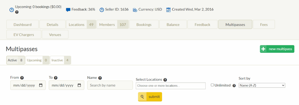 - Name: Show Multipasses whose name contains the text presented in this field.