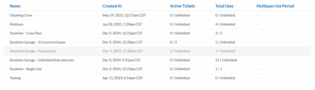 - Sort By: This dropdown filters passes by options of Name (A-Z or Z-A), Created Date (newest or oldest), Total Uses (most or least), Active Tickets (most or least), and Usage Window (earliest or latest).