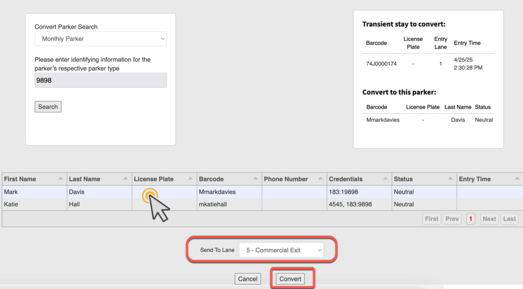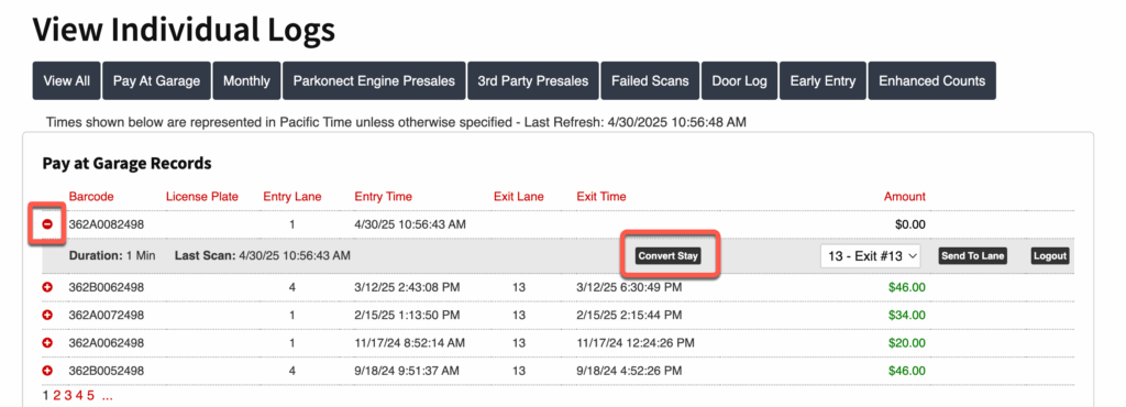 Convert Stay is a Parkonect feature that allows support agents to convert a Transient parking session into a Monthly stay when a Monthly parker was not properly recognized at entry. This tool is especially useful in handling unnecessary payment prompts at the exit kiosk for Monthly parkers at Parkonect Flex locations. Whether due to a missing license plate in the system, use of the wrong entry method, or LPR misreads, Convert Stay ensures that Monthly parkers are properly processed and accounted for. In just a few steps within the Garage Log, agents can resolve the issue in real time, while also updating account information (such as license plates) to help prevent repeat occurrences.