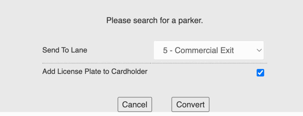 The Convert Stay option is a default function of the Garage Log, but the Add License Plate option requires the Convert Stay Add License Plate flag to be checked.