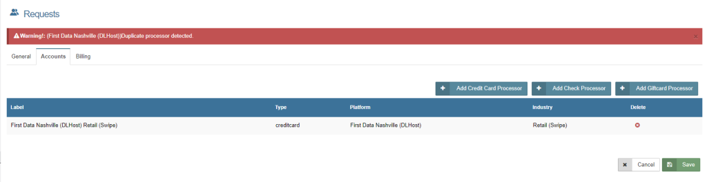 When processing a Merchant Change Request, such as to add or change the version number. If you get a “Warning!: (First Data Nashville (DL Host))Duplicate processor detected.” error this is likely due to the MID used on multiple accounts.