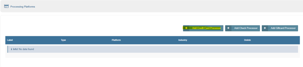 - Select “Add Credit Card Processor” and a window will pop up to Set Platform to the merchant platform for which the customer provided information (e.g. FMDS, TSYS, Paymentech, etc.)