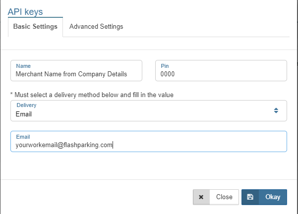 - Set Key Name to Merchant Name and Pin Number to 0000.