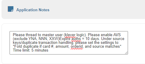 - For Chase Paymentech accounts, add the additional note: PAYMENTECH: Disable AVS!